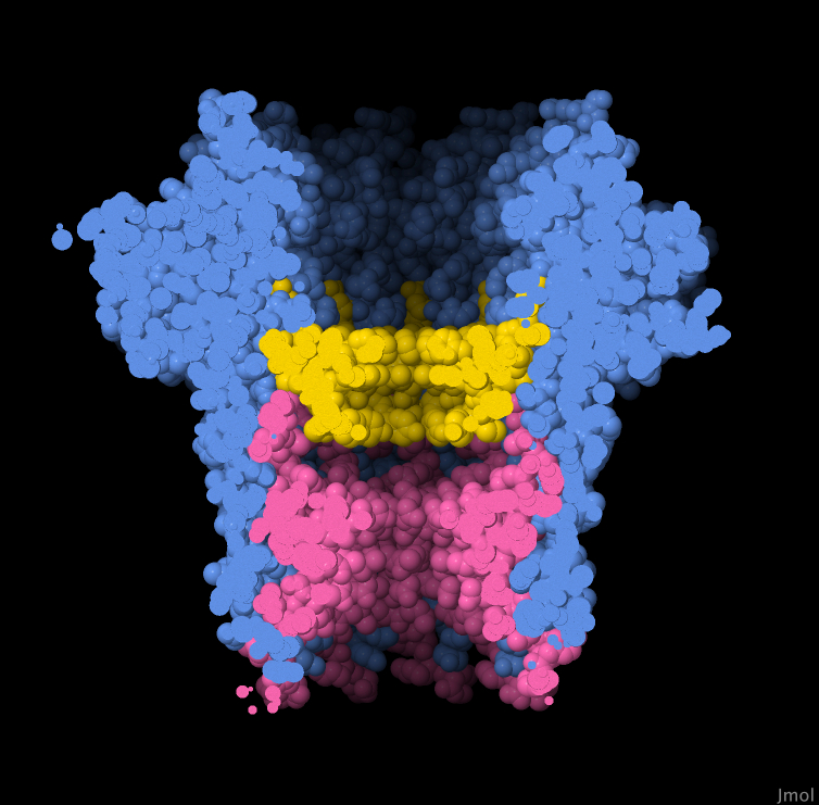 Scientists have engineered nanopores with greater pore stability and tuned for optimal function. For example, dual constriction nanopores add an accessory protein to CsgG to introduce a second constriction for detecting DNA. The CsgG-CsgF complex shown here (PDB ID 6si7) highlights the CsgG molecule in blue with its pore-forming region in yellow, and the CsgF molecule in pink. CsgG forms the initial constriction point for DNA and CsgF adds a second constriction. Integrating the signal from two constriction sites improves base-reading accuracy, particularly in DNA stretches with multiple consecutive copies of the same base. Click on the image to explore this structure in an interactive JSmol.