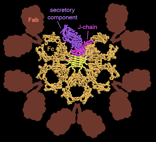 - Secretory IgA also forms larger complexes, with more than two Y-shaped antibodies. To explore some of them, search for “secretory IgA” at the main RCSB PDB site.