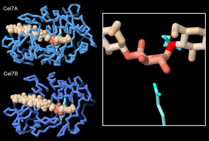 Cellulases use many molecular tricks to streamline their function. As seen above, they often have domains or surfaces that bind to the surface of cellulose fibers. The shape of the cellulose-binding site is also tuned to perform a specialized function. In Cel7A (PDB ID 4c4c), several loops embrace the cellulose strand, forming a tunnel with the active site at one end. Because of this, Cel7A cleaves small two-sugar fragments from the end of the cellulose fiber. However, Cel7B (endogluconase EG-1, PDB ID 1eg1) is missing these loops and has an open groove that can bind to cellulose chains anywhere along their length, allowing it to cleave cellulose in the middle of a chain. The close-up picture at right shows another molecular trick: these enzymes often distort one sugar ring (shown here in brighter pinks) into a less-stable conformation. This distortion helps activate the connecting oxygen (in red) for the cleavage reaction catalyzed by two glutamates (turquoise). Click on the image to explore these structures in an interactive JSmol. Note that the cellulose chain from PDB ID 4c4c is displayed for both proteins.