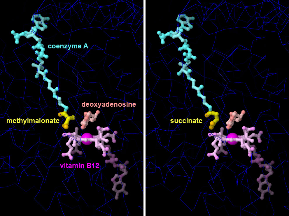 The largest vitamin, vitamin B12 (cobalamin), is used by only a handful of enzymes in our cells. The one shown here, methylmalonyl coenzyme A mutase (PDB ID 4req), interconverts methylmalonate and succinate by removing a carbon atom and replacing it in a slightly different place. During the reaction, the molecule is held close to vitamin B12 by the cofactor coenzyme A, which itself is built using vitamin B5. This is an important step in the breakdown of amino acids, converting them to succinate that can fuel the citric acid cycle. This structure includes both states of the molecule. The reaction is performed by the central cobalt atom of vitamin B12, with the assistance of a nearby molecule deoxyadenosine. To explore this structure in more detail, use the menu to view an interactive JSmol.
