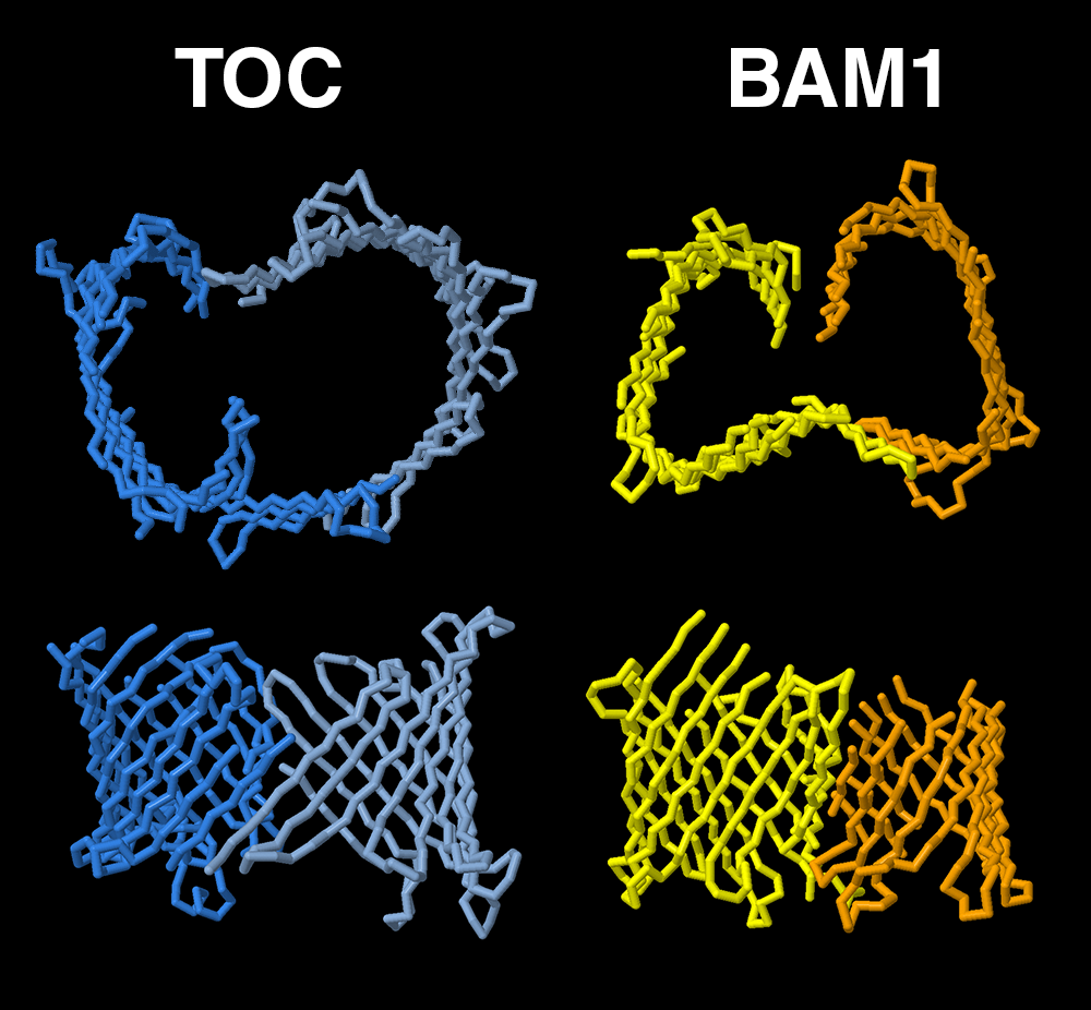 The large central channel of the TOC complex is a hybrid β-barrel that is formed between two Toc proteins (Toc75 and Toc120/Toc90). At its widest, this channel is about 20 angstroms across, which is large enough to allow passage for some folded proteins. The structure of the TOC β-barrel has striking similarities to a β-barrel found in a gram-negative bacterial protein complex called BamA (6V05), suggesting that the TOC channel may have its origins as a bacterial membrane protein. Click on the jsMol tab to compare the TOC β-barrel to the BamA β-barrel structure.