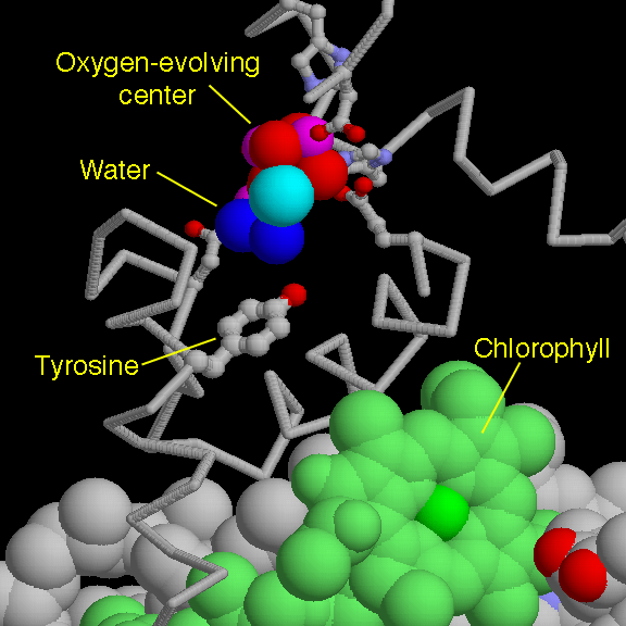 1s5l a bicarbonate ion is bound to the cluster, providing a clue for location of the active site. The picture shows two oxygen atoms from this ion (colored blue): one is bound to a manganese ion, the other is bound to the calcium ion. Notice that the oxygen-evolving center is surrounded by histidines, aspartates and glutamates, which hold it in place. The tyrosine shown in the middle forms a perfect bridge between the water site and the light-capturing chlorophyll.