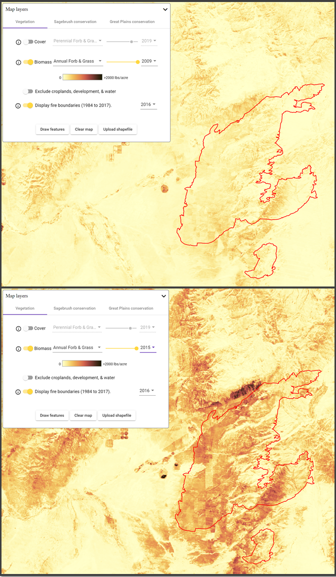 In the portion of the Great Basin in which the Hot Pot fire burned, annual grasses like cheatgrass drive wildfire cycles by making fires more frequent. Because RAP tracks Annual Forb and Grass biomass production, it can be useful for uncovering relationships between production and wildfire risk. In the two maps below, displayed on top is a roughly average Annual Forb and Grass biomass production year (2009) and on the bottom is Annual Forb and Grass biomass from 2015, the year preceding the Top Pot fire. In both maps, the "Display Fire Boundaries" switch is turned on for 2016 to show the outline of the Hot Pot fire. 2015 was a near-record year for Annual Forbs Grass production in this region and may have contributed to this large fire.
