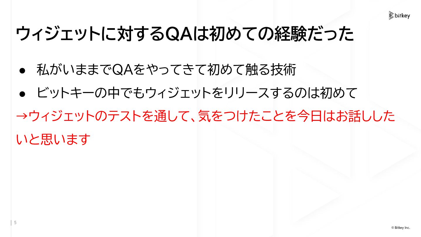 4 4 © Bitkey Inc. ウィジェットに対するQAは初めての経験だった • 私がいままでQAをやってきて初めて触る技術 • ビットキーの中でもウィジェットをリリースするのは初めて
