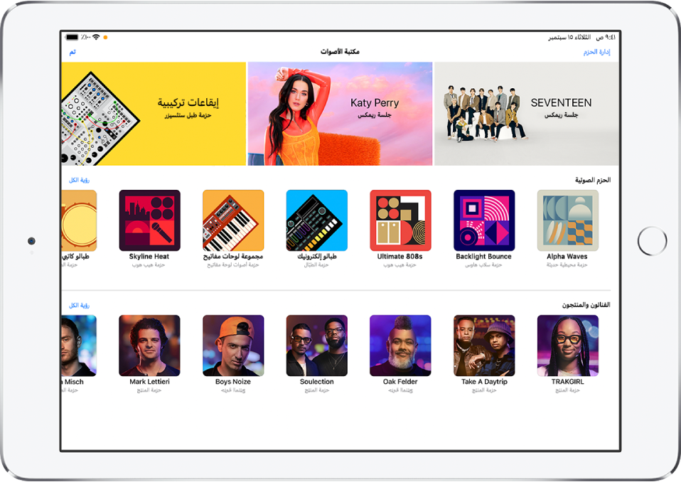 يمكنك استخدام مكتبة الأصوات لتنزيل حزم الأصوات التي تحتوي على مئات التكرارات الحلقية والأصوات والآلات الموسيقية التي تعمل باللمس وعُدد الطبول والمزيد وإدارتها. يقوم كراج باند بإعلامك عند توفر حزم صوتية جديدة للتنزيل.