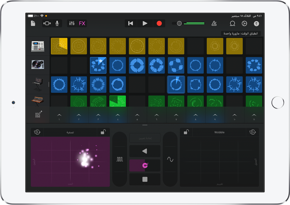 يمكنك استخدام الحلقات الصوتية الحية لإنشاء موسيقى إلكترونية عن طريق الضغط ببساطة على الخلايا والأعمدة في الشبكة لتشغيل تكرارات حلقية موسيقية. يمكنك إنشاء التوزيعات الخاصة بك، ثم ارتجال عرض الحلقات الصوتية الحية وتسجيله.
