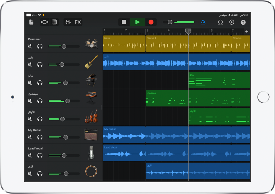 يمكنك الاختيار من بين المئات من ملفات الحلقات الصوتية من Apple لإضافتها إلى أغنيتك وإضافة طبال يعزف أثناء الموسيقى المسجلة وخلط الأغنية بالمكوّنات الإضافية للتأثيرات.
