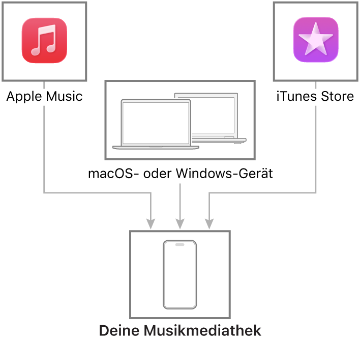 Stelle eine Verbindung zu deinem Mac- oder Windows-Gerät her, um Musik zwischen deinem iPhone und deinem Gerät zu übertragen und sie zu aktualisieren. Um unterstützte Inhalte zu synchronisieren, verwende „Musik“ (macOS 10.15 oder neuer) oder iTunes (macOS 10.14 oder neuer und ein Windows-Gerät).