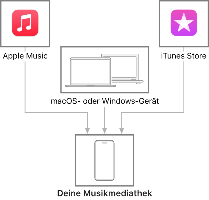 Stelle eine Verbindung zu deinem Mac- oder Windows-Gerät her, um Musik zwischen deinem iPhone und deinem Gerät zu übertragen und sie zu aktualisieren. Um unterstützte Inhalte zu synchronisieren, verwende „Musik“ (macOS 10.15 oder neuer) oder iTunes (macOS 10.14 oder neuer und ein Windows-Gerät).