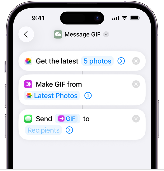 Μια ενέργεια –το δομικό τμήμα μια συντόμευσης– είναι ένα βήμα σε μια εργασία. Συνδυάστε ενέργειες για να δημιουργήσετε συντομεύσεις που αλληλεπιδρούν με τις εφαρμογές και το περιεχόμενο στις συσκευές Apple σας, καθώς και με περιεχόμενο και υπηρεσίες στο Διαδίκτυο. Κάθε συντόμευση αποτελείται από μία ή περισσότερες ενέργειες.