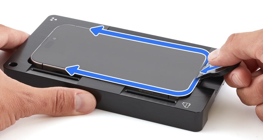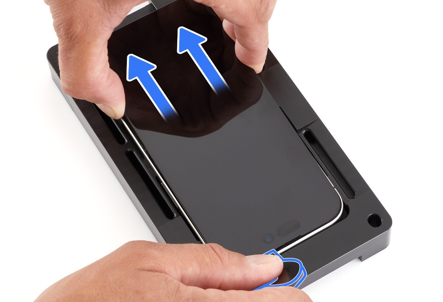 13. Insert the edge of the adhesive cutter between the display and the enclosure. Run the cutter between the display and the enclosure to the right and left as shown until the display partially releases from the enclosure.