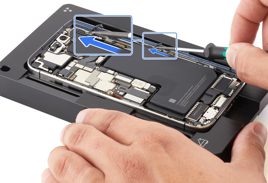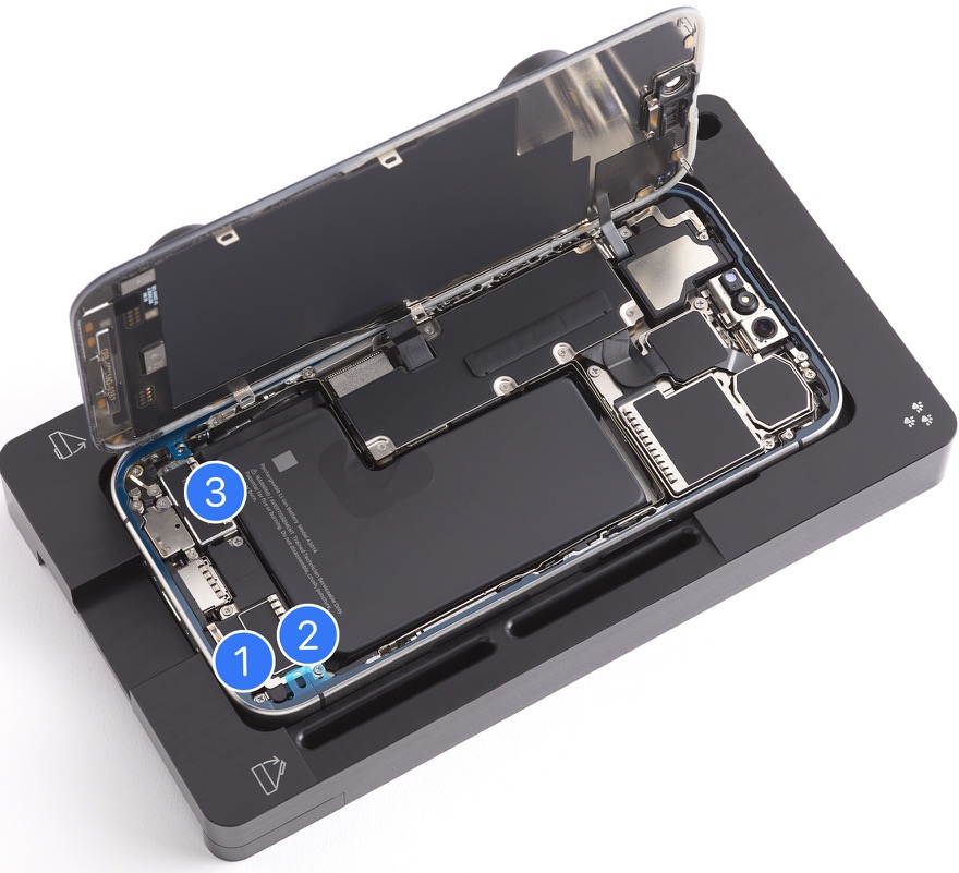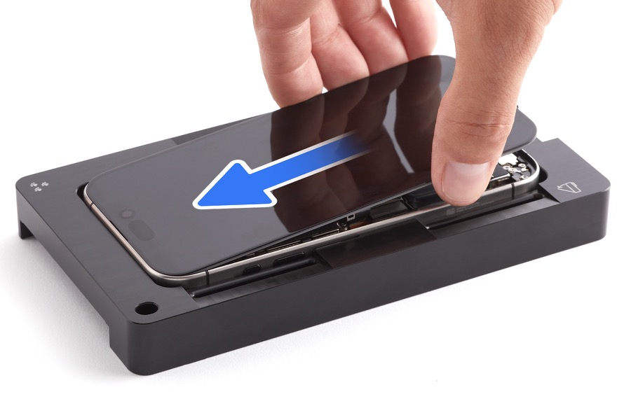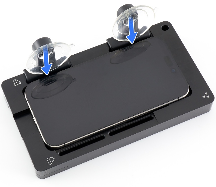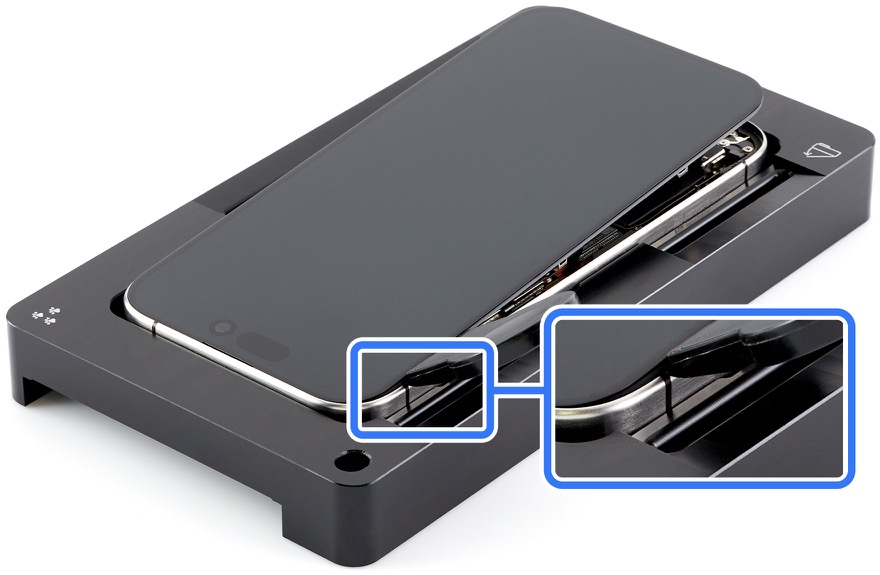 1. Place the iPhone in the repair tray with the display faceup and the USB-C connector facing the cutout.