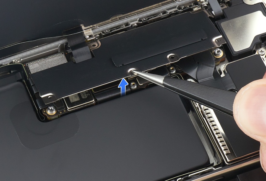23. Use ESD-safe tweezers to tilt up the logic board cowling.