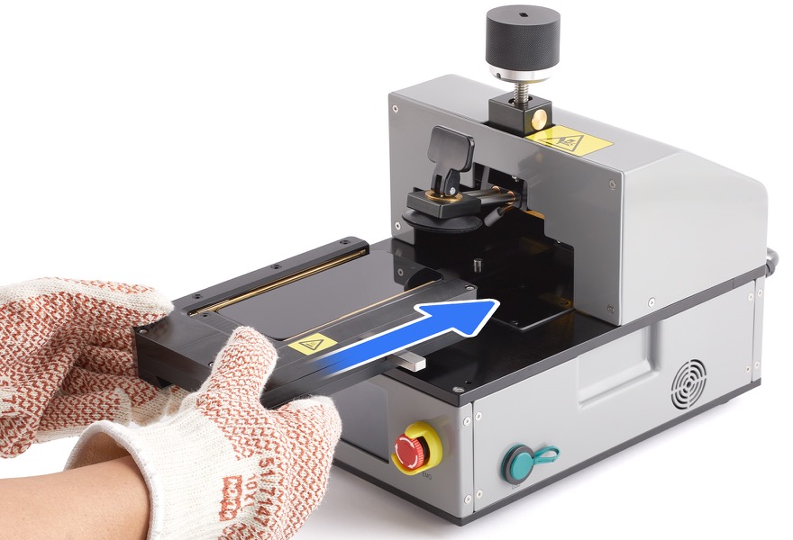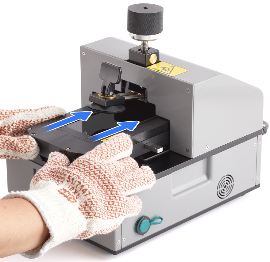 7. Put on the heat-resistant gloves. Align the cutout on the bottom of the pocket with the rail on the fixture. Slide the pocket with the iPhone onto the rail.