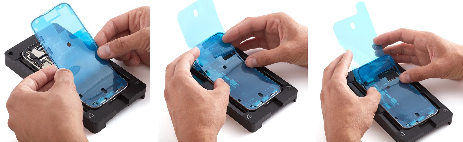 6. Use ESD-safe tweezers to peel the adhesive backing off the replacement top speaker grille.