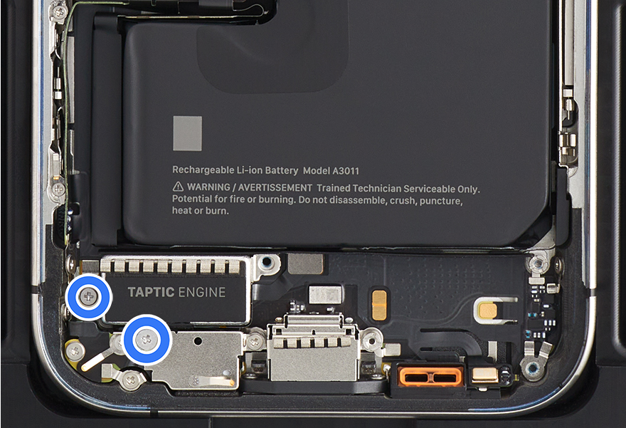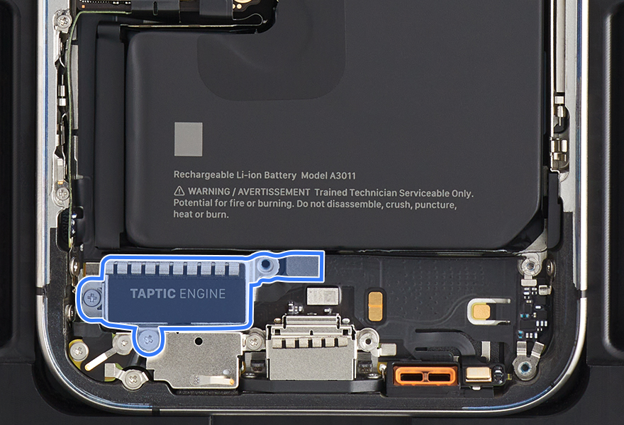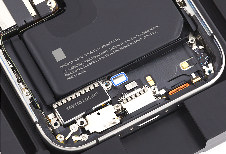 1. Inspect the Taptic Engine grounding spring in the bottom left corner of the enclosure. If the grounding spring isn’t bent or damaged, skip to step 4. If the grounding spring is bent or damaged, continue to step 2.