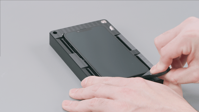 24. Position the repair tray with the iPhone in the display press and the display faceup. Pull down the lever until the display press locks.