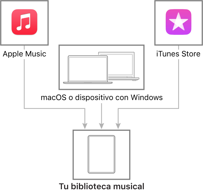 Conecta tu Mac o dispositivo con Windows para transferir y actualizar música entre tu iPad y tu dispositivo. Para sincronizar contenido compatible, usa Música (macOS 10.15 o posterior) o iTunes (macOS 10.14 o anterior, y dispositivos con Windows) en tu computadora: