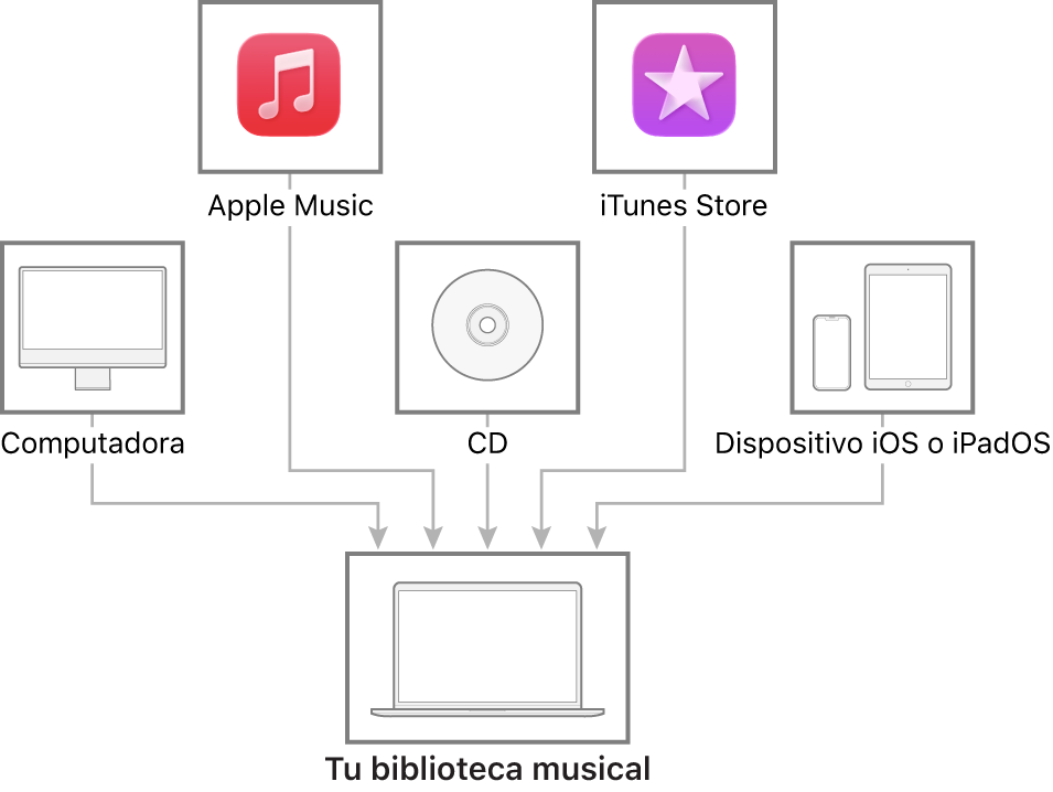 Si no te suscribes a Apple Music y quieres agregar tus canciones o álbumes favoritos, puedes comprar y descargar música desde iTunes Store. Y, si has comprado elementos de iTunes Store, puedes descargarlos a tus computadoras y dispositivos autorizados (hasta 10 en total).