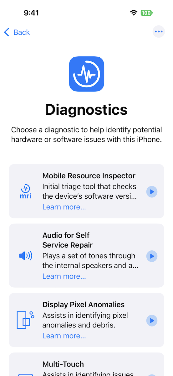 Diagnostische suite | iPhone 15 en iPhone 15 Plus Alle iPhone 16-modellen Alle iPhone 17-modellen iPhone Air iPhone 16e iPhone 17e | Alle andere ondersteunde iPhones | iPad mini (A17 Pro) | iPad Air (M2) iPad Air (M3) iPad (A16) iPad Air (M4) | iPad Pro (M4) iPad Pro (M5) |