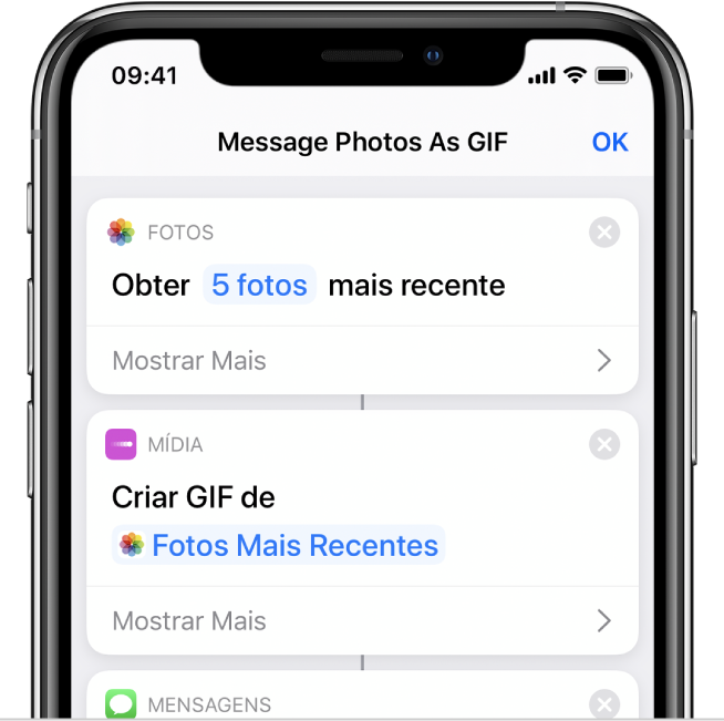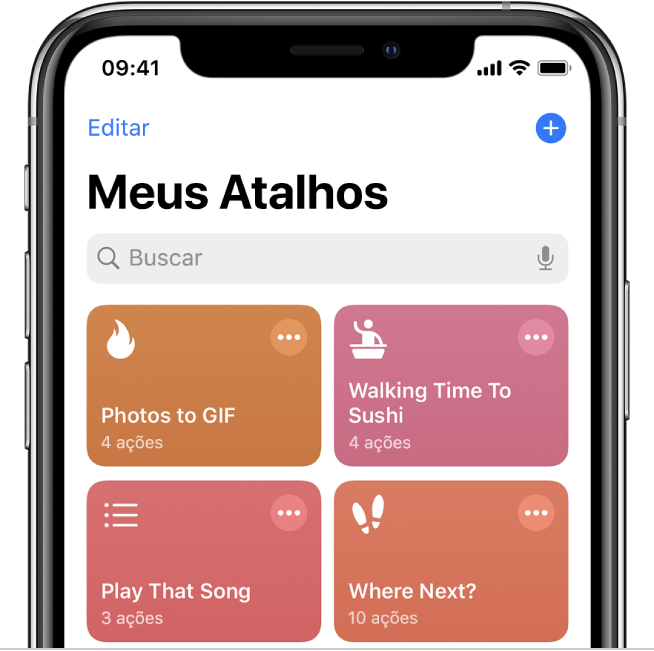 Um atalho é uma maneira rápida de realizar uma ou mais ações com apps. O app Atalhos permite que você crie os seus próprios atalhos com vários passos. Por exemplo, construa um atalho “Hora de Surfar” que obtém o relatório de surfe, fornece um tempo de chegada até a praia e abre uma playlist de músicas de surfe.