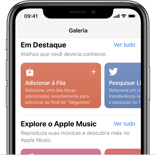 A Galeria oferece uma coleção seleta de atalhos criativos e úteis. Explore a Galeria para conferir as possibilidades de atalhos e ver como eles são feitos. Quando encontrar um atalho da Galeria que você goste, toque nele para adicioná-lo à Meus Atalhos e personalize-o conforme as suas necessidades.