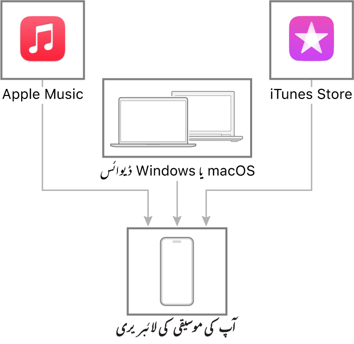 اپنے iPhone اور اپنے ڈیوائس کے درمیان موسیقی ٹرانسفر اور اپڈیٹ کرنے کے لیے اپنا Mac یا Windows ڈیوائس کنکٹ کریں۔ اعانت یافتہ مواد سِنک کرنے کے لیے، ”موسیقی“ (macOS 10.15 یا بعد کا ورژن) یا iTunes (macOS 10.14 یا پہلے کے ورژن اور Windows ڈیوائس) کا استعمال کریں۔