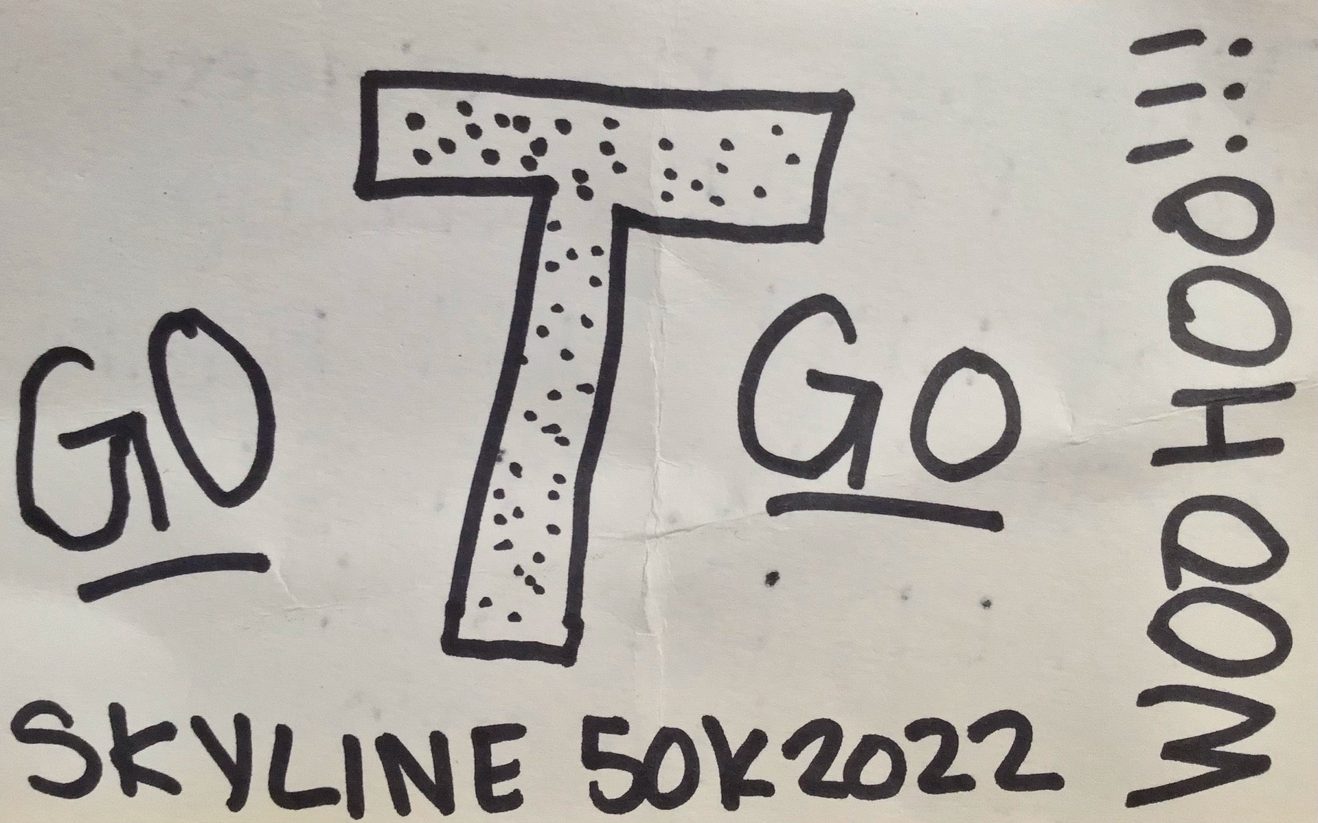 📷5: From there on it was steady work making it up and down various trails as it warmed up in the first half of the race. Made it up to the Skyline Gate station where Vivek was waiting with my drop bag, and handed me a surprise race sign card that Amanda had made for me.