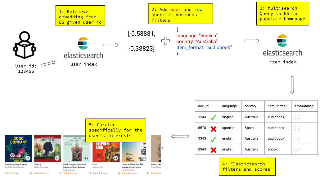 - The recommendations service once again queries Elasticsearch, this time with the user’s embedding along with their user query filters. This query is a multi-search request to the item index: one for every desired row