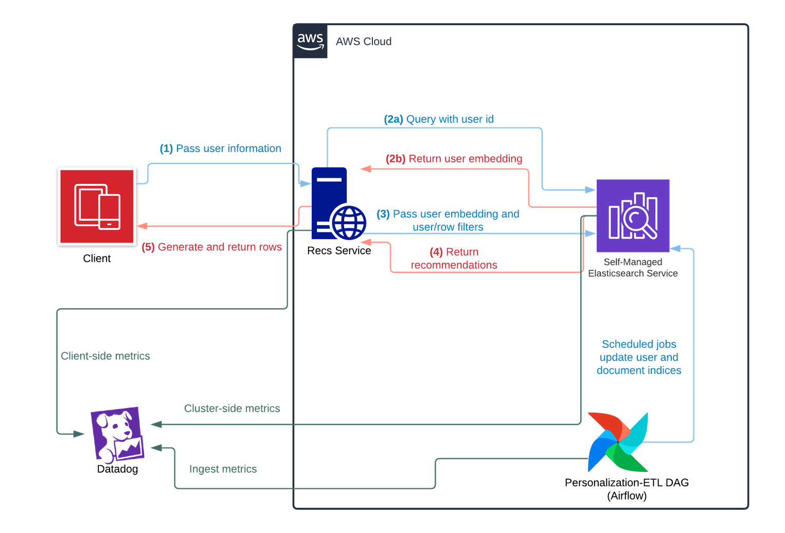The underlying Personalization model is very large, making retraining it a very expensive process. Thus, it needs to be retrained often enough to account for factors like user preference drift but not too often so as to be efficient with computational resources. We found retraining the model weekly worked well for us. item embeddings, which typically update only incrementally, are also recomputed weekly. However, user embeddings are recomputed daily to provide fresh recommendations based on changing user interests. These embeddings along with relevant metadata are ingested into the Elasticsearch index in a batch process using Apache Spark and are scheduled through Apache Airflow. We monitor this ingest process along with real-time serving metrics through Datadog.