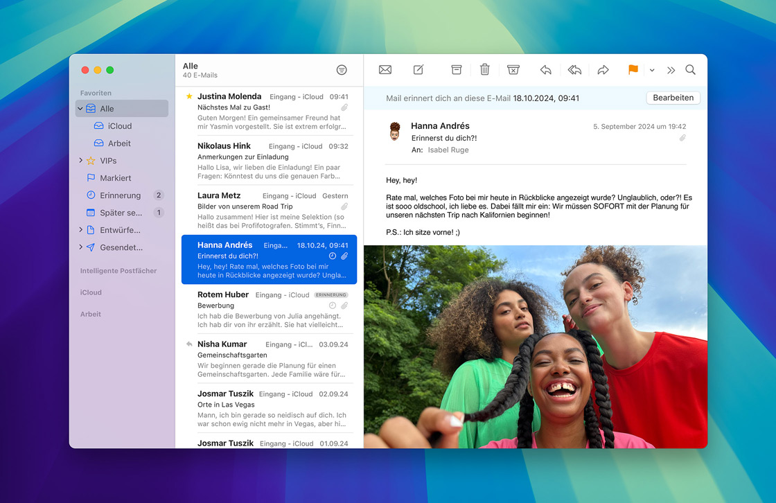 Weitere InfosiCloud Mail ist nahtlos in die Mail App auf deinem iPhone, iPad oder Mac integriert und iCloud.com macht es einfach, von überall E‑Mails zu senden und zu empfangen. Sicherheitsfeatures wie Schutz vor Spam und Antiphishing sind integriert, um Spam Mails zu erkennen und zu blockieren, bevor sie in deinem Posteingang landen. Du kannst deine eigene @icloud.com E‑Mail Adresse ganz einfach einrichten. Mit einem iCloud+ Abo kannst du deine E‑Mail mit einer eigenen Domain personalisieren.