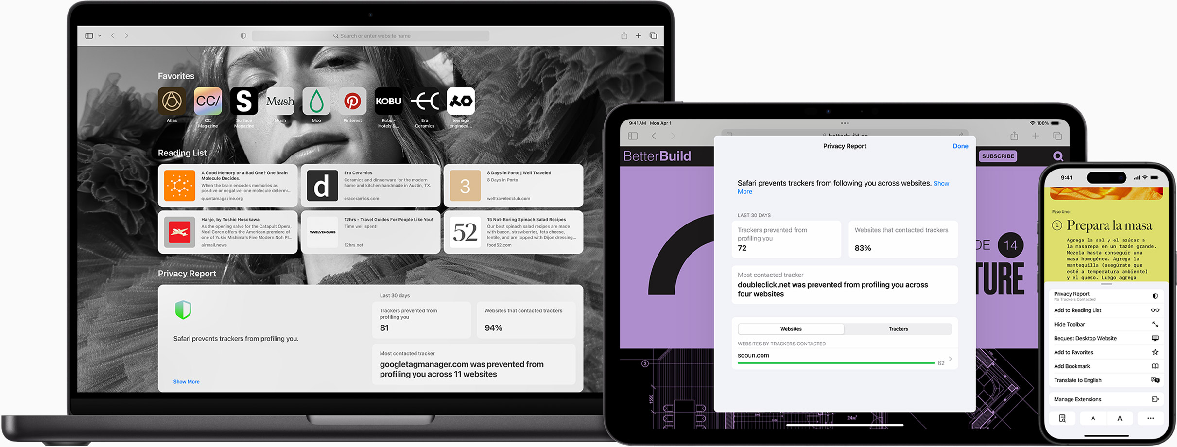 Safari makes it simple to see how your privacy is protected on all the websites you visit. Click Privacy Report in the Safari menu for a snapshot of cross-site trackers currently prevented from profiling you on the website you’re visiting. Or view a weekly Privacy Report to see how Safari protects you as you browse over time.