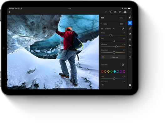 Un iPad mini en mode portrait affiche un projet coloré dans Adobe Photoshop.
