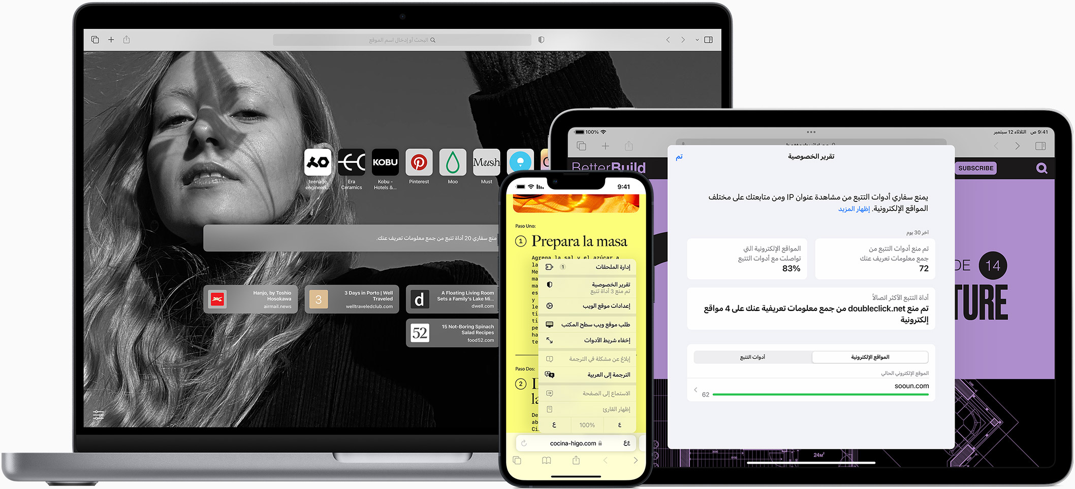 اعرف كيف تجعل سفاري متصفحك الافتراضييتميز متصفح سفاري بتكنولوجيا مدمجة رائدة في مجالها لحماية الخصوصية تشمل خاصية منع التعقب الذكي التي تحدد أدوات التتبع وتساعد على منعها من جمع معلومات عنك أو ملاحقة نشاطك عبر الإنترنت. ومع نمط التصفح الخاص، تحصل على حماية إضافية مثل قفل النوافذ عندما لا تستخدمها. خصوصيتك على الإنترنت يجب ألا تكون أُمنية أو أملاً بل أمراً مضموناً قولاً وفعلاً.