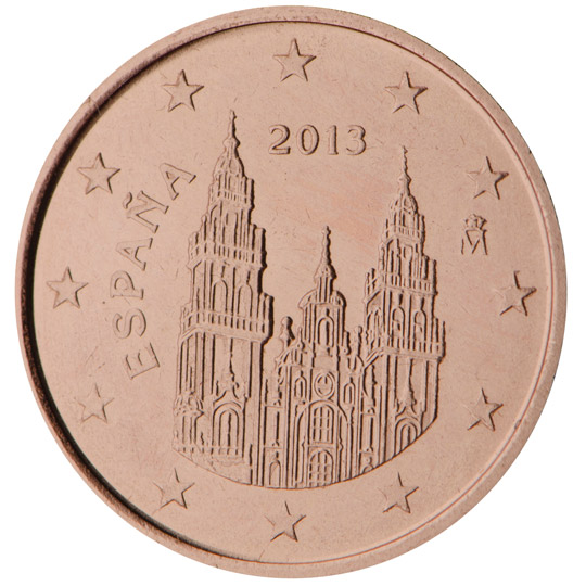 Monety 1, 2 i 5 centów przedstawiają katedrę w Santiago de Compostela – klejnot hiszpańskiej architektury romańskiej i jedno z najsłynniejszych miejsc pielgrzymkowych na świecie. Na monetach widać monumentalną fasadę Obradoiro, będącą wspaniałym przykładem hiszpańskiego baroku. Jej budowę rozpoczęli w 1667 Jose del Toro i Domingo de Andrade, a ukończył w XVIII w. Fernando Casas y Novoa. Hiszpania