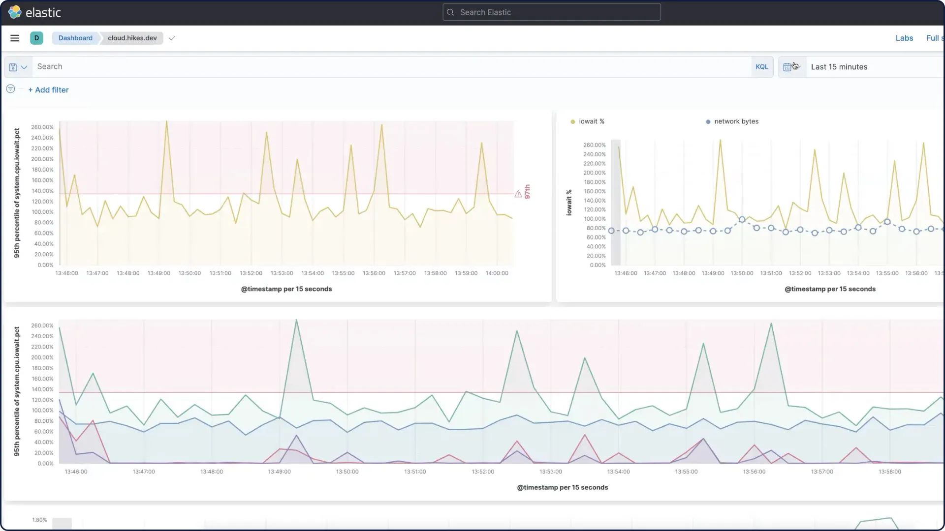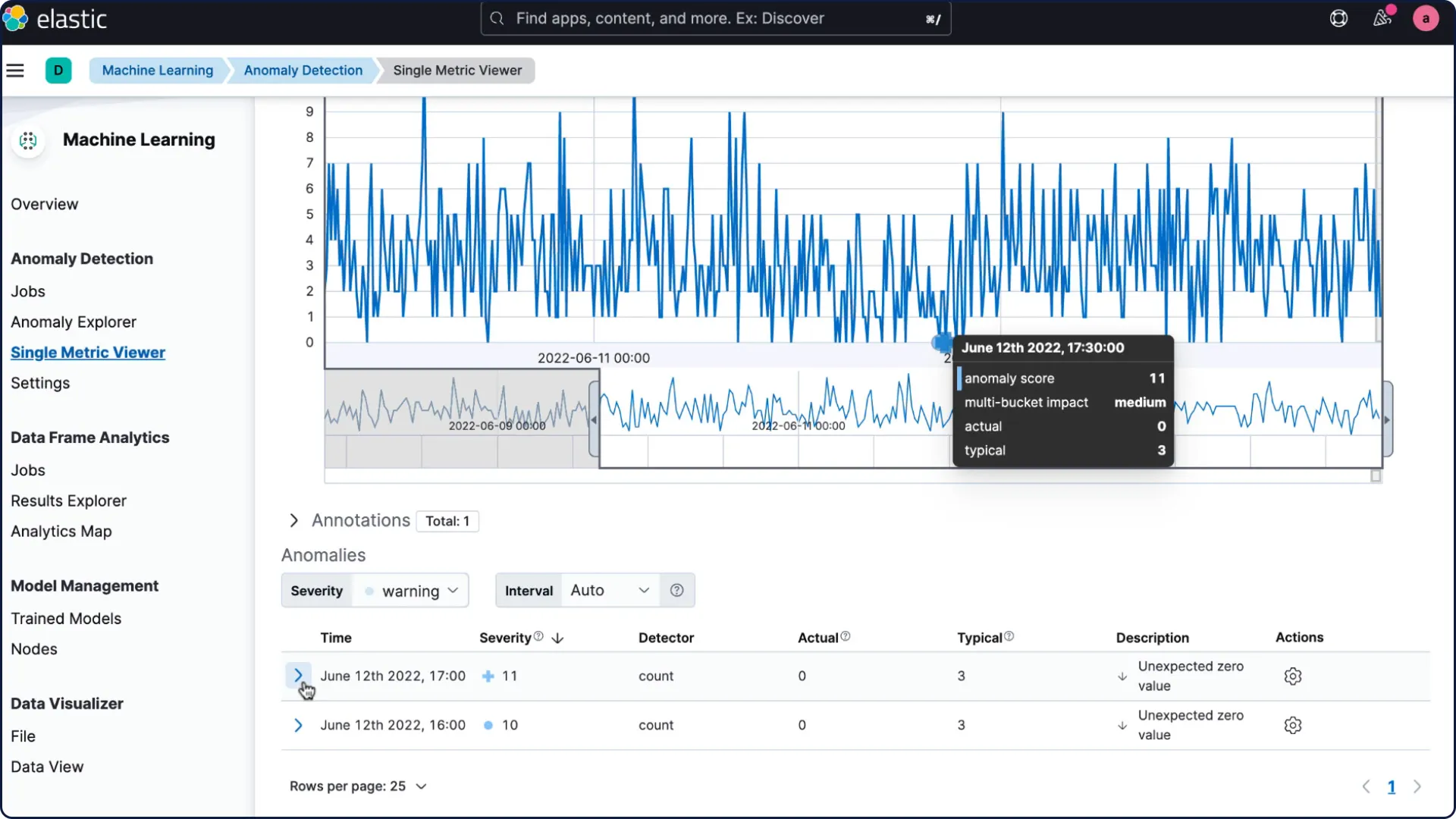 Use Elastic's machine learning to automatically detect anomalies in your data, classify into categories, or identify trends that lead you to root causes. After visualizing data with Kibana Lens, you can transition straight into configuring the appropriate machine learning from your dashboard.