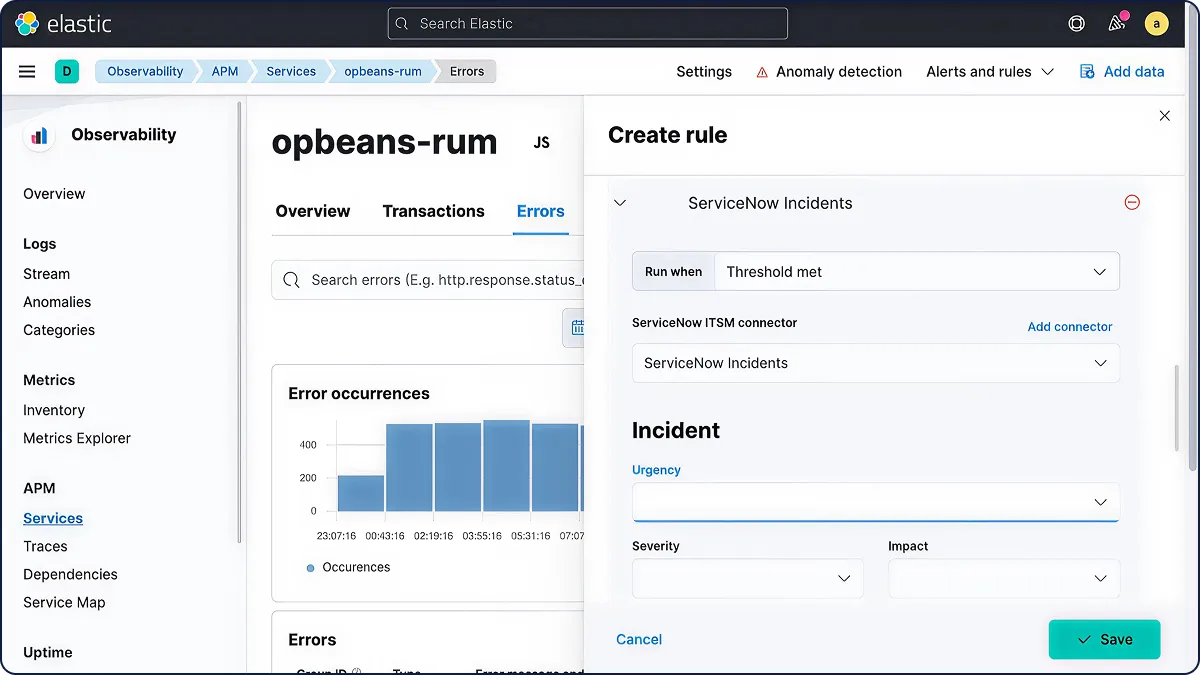 Keep critical changes on your radar to avoid crisis scenarios. Create alerts that use index- and metric-based thresholds to send emails, create Slack notifications, activate PagerDuty workflows, or any number of other third party integrations. Define unique alerts from within Discover, Elastic Observability, and Elastic Security and monitor them holistically in the Management tab.