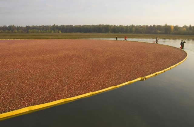Cranberries grown commercially in large beds are harvested by flooding the field. Photo courtesy Wisconsin State Cranberry Growers Association.