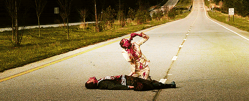 I shook off my surprise and started booking it across the parking lot again. One of the zombies broke toward us and caught up to us pretty easily since we were slowed down by Dave's injury. I pushed my husband behind me and did the thing you always see at some point in zombie movies.