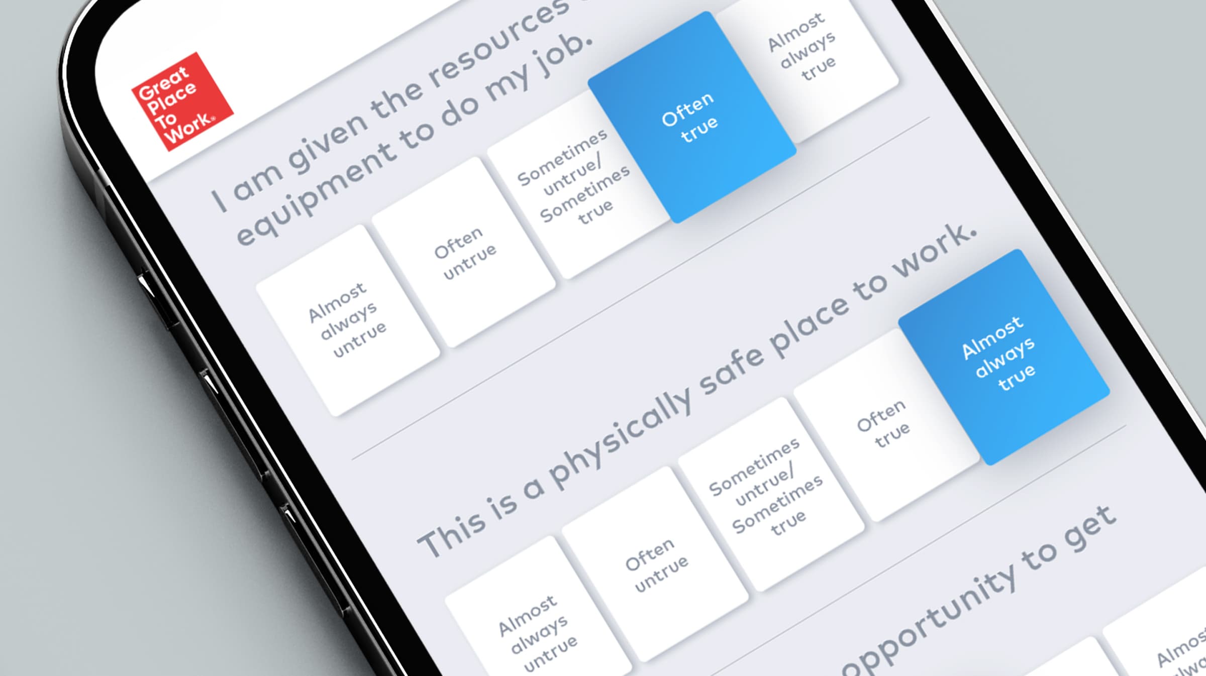 In broad terms, the Great Place To Work Trust Index™ Survey measures the level of trust in your organization and the consistency of the employee experience. In other words: How often can employees count on something happening in their workplace, such as clear and honest leadership, fair treatment, and employee recognition?