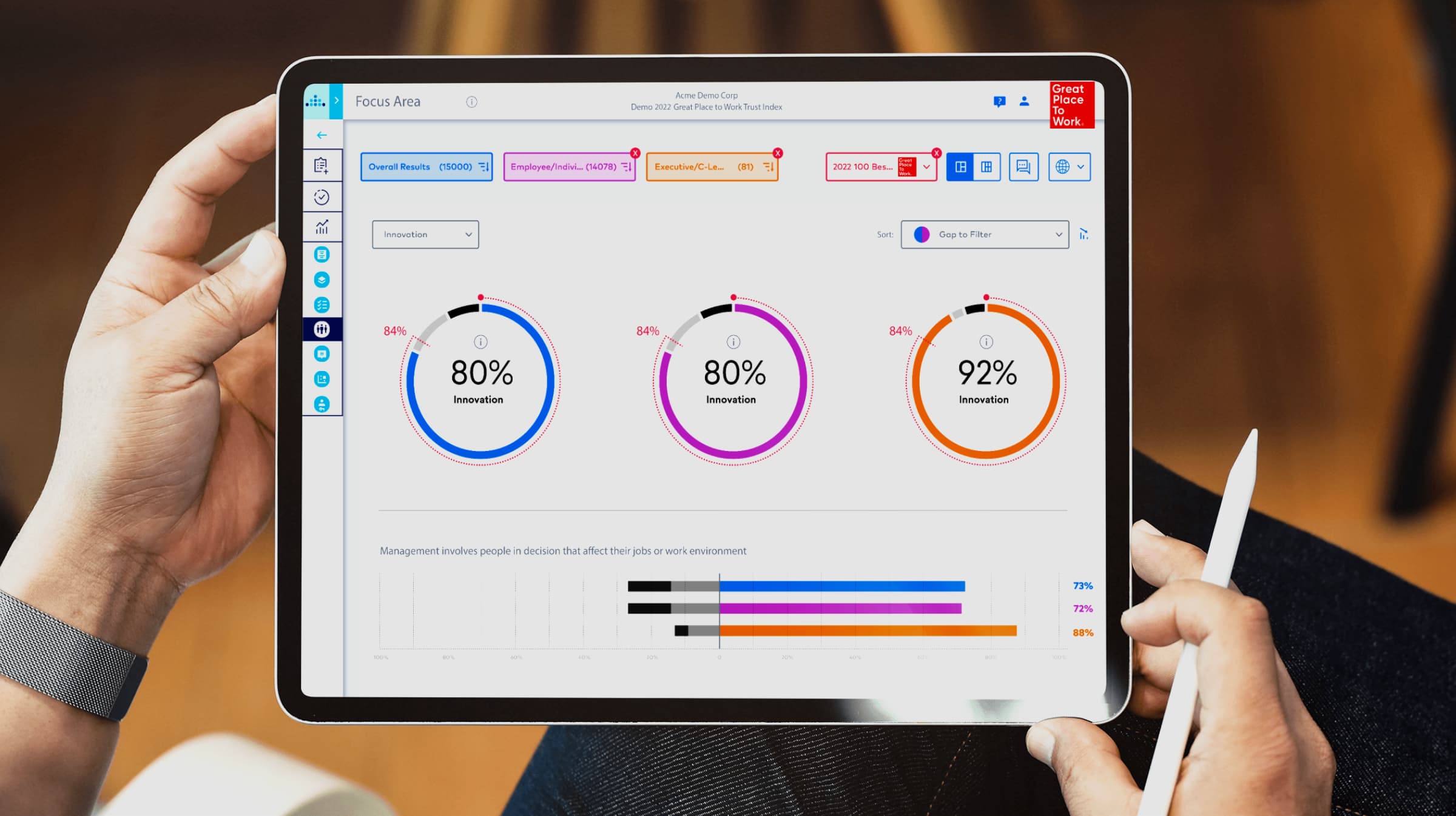 Using data-backed insights, you will be able to make more informed decisions and get a benchmarked view of your organization, creating a thriving culture.