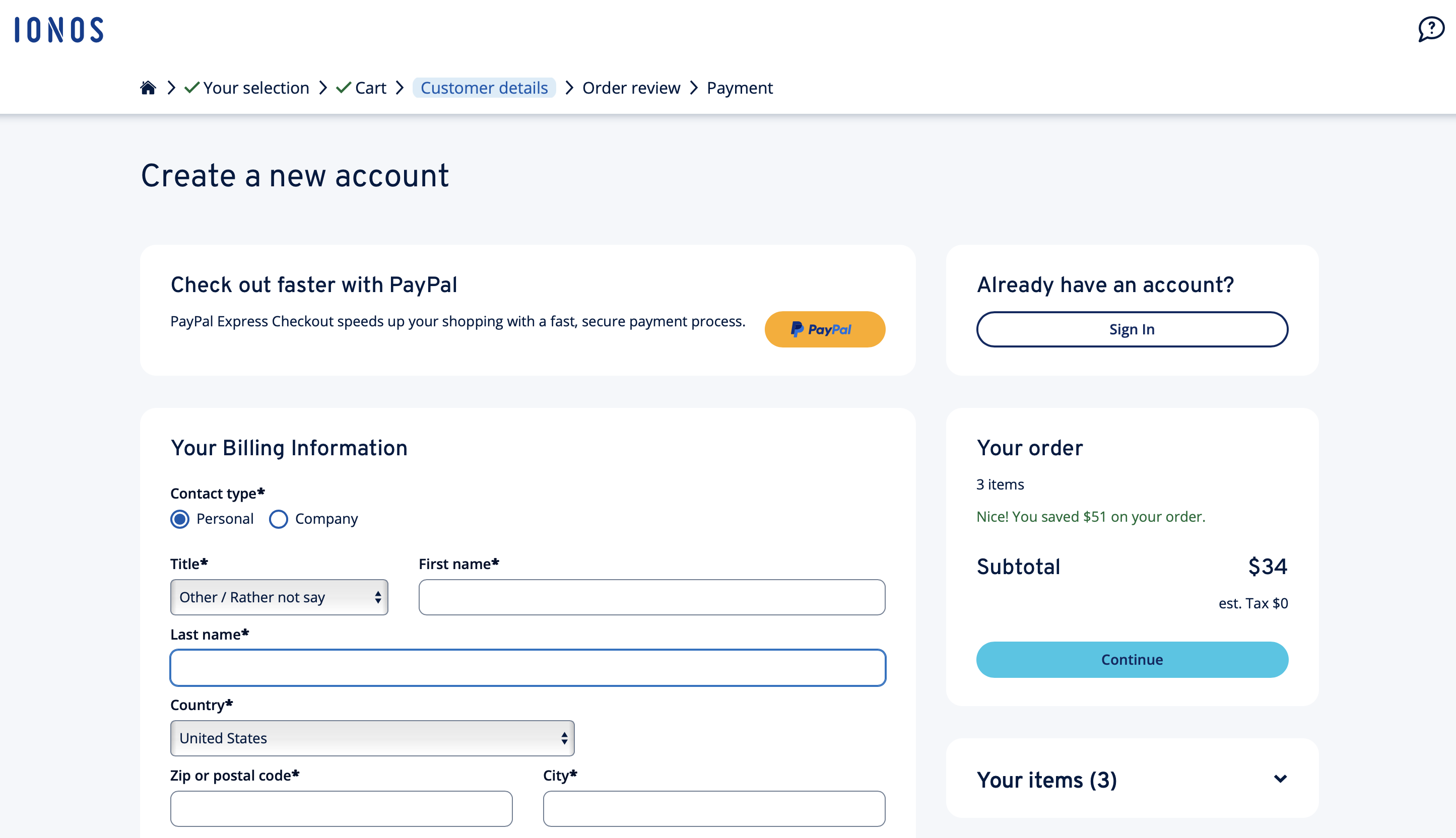 Después de hacer clic en “Continuar” (Continue), crea una cuenta IONOS o inicia sesión en tu cuenta activa de IONOS para continuar con el proceso de pago. También puedes abonar tu(s) dominio(s) directamente con PayPal, Apple Pay o Google Pay.