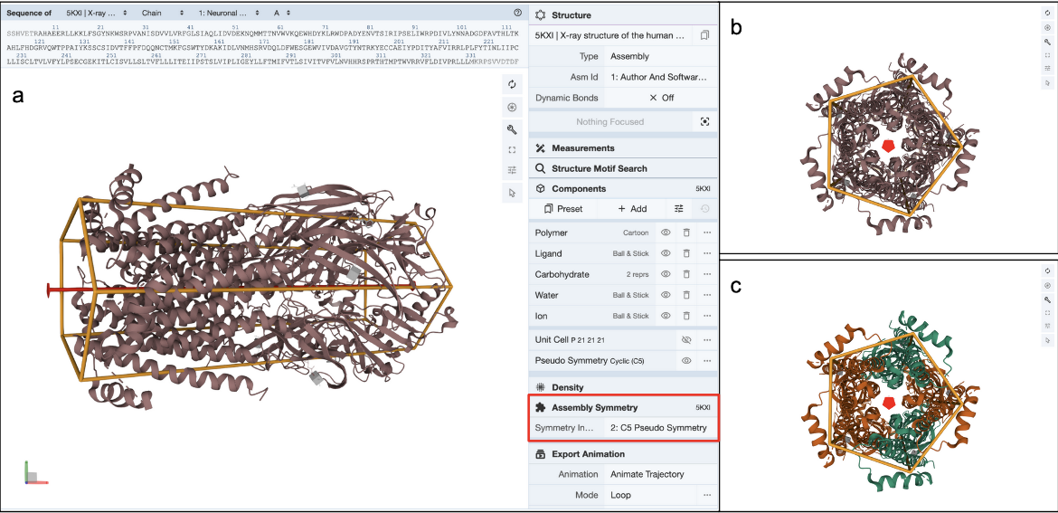 Clicking on the (3D View) link next to the “Pseudo Symmetry: Cyclic - C5” opens the structure in Mol* (Figure 7a). You can rotate the molecule to view down the 5-fold pseudosymmetry axis (Figure 7b) and color the proteins by entity type (Figure 7c). Note this assembly has a pseudo pentameric symmetry - composed of two alpha-4 (green colored) and three beta-2 (orange colored) chains.