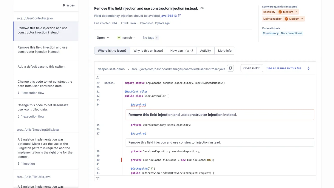 The best place to find and fix issues? Right in your IDE, with on-the-fly optimized feedback on issues that can lead to bugs, security issues, code smells, and other problems.