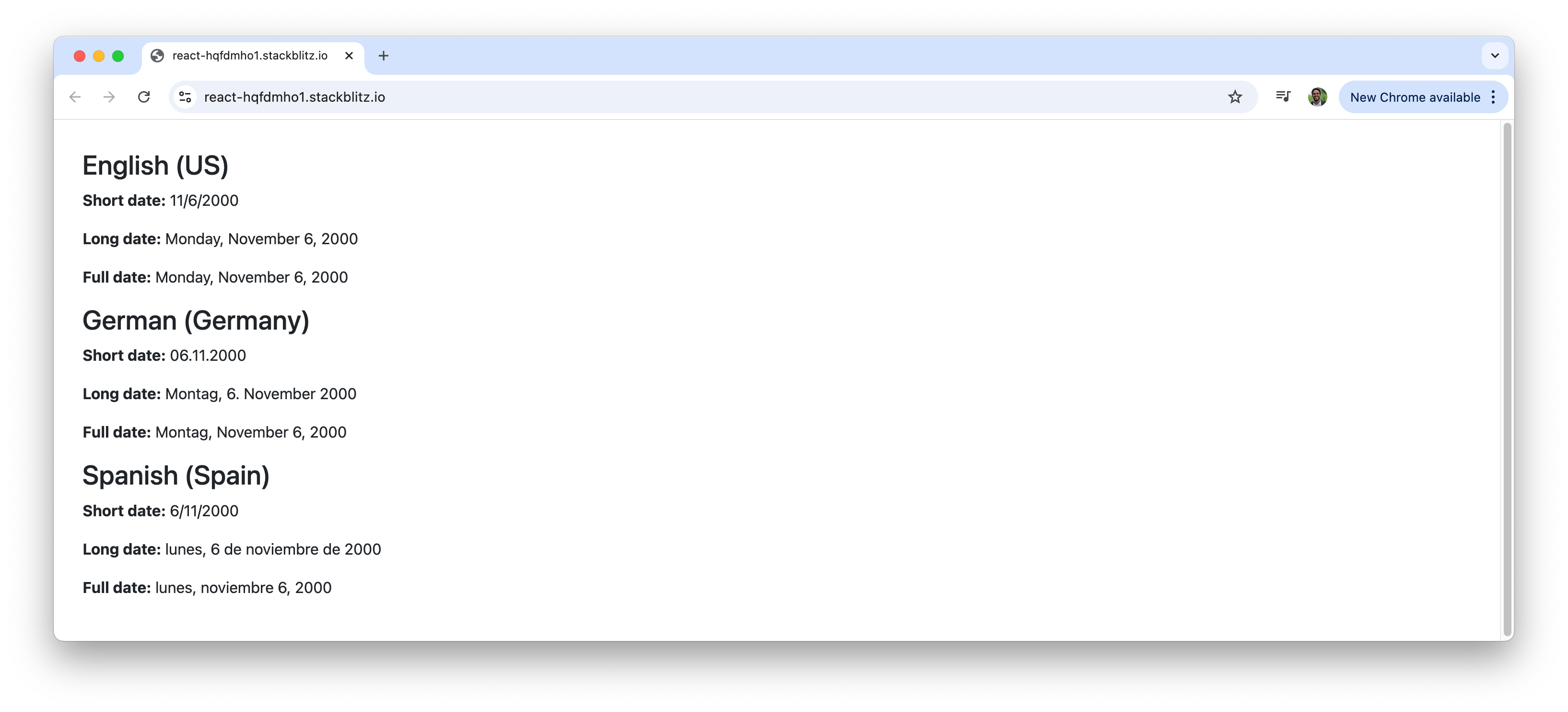 'd' - short date pattern'D' - long date pattern'EEEE, MMMM d, y' for full controlRunning this app displays the same date (November 6, 2000) formatted in three different ways across English, German and Spanish locales: