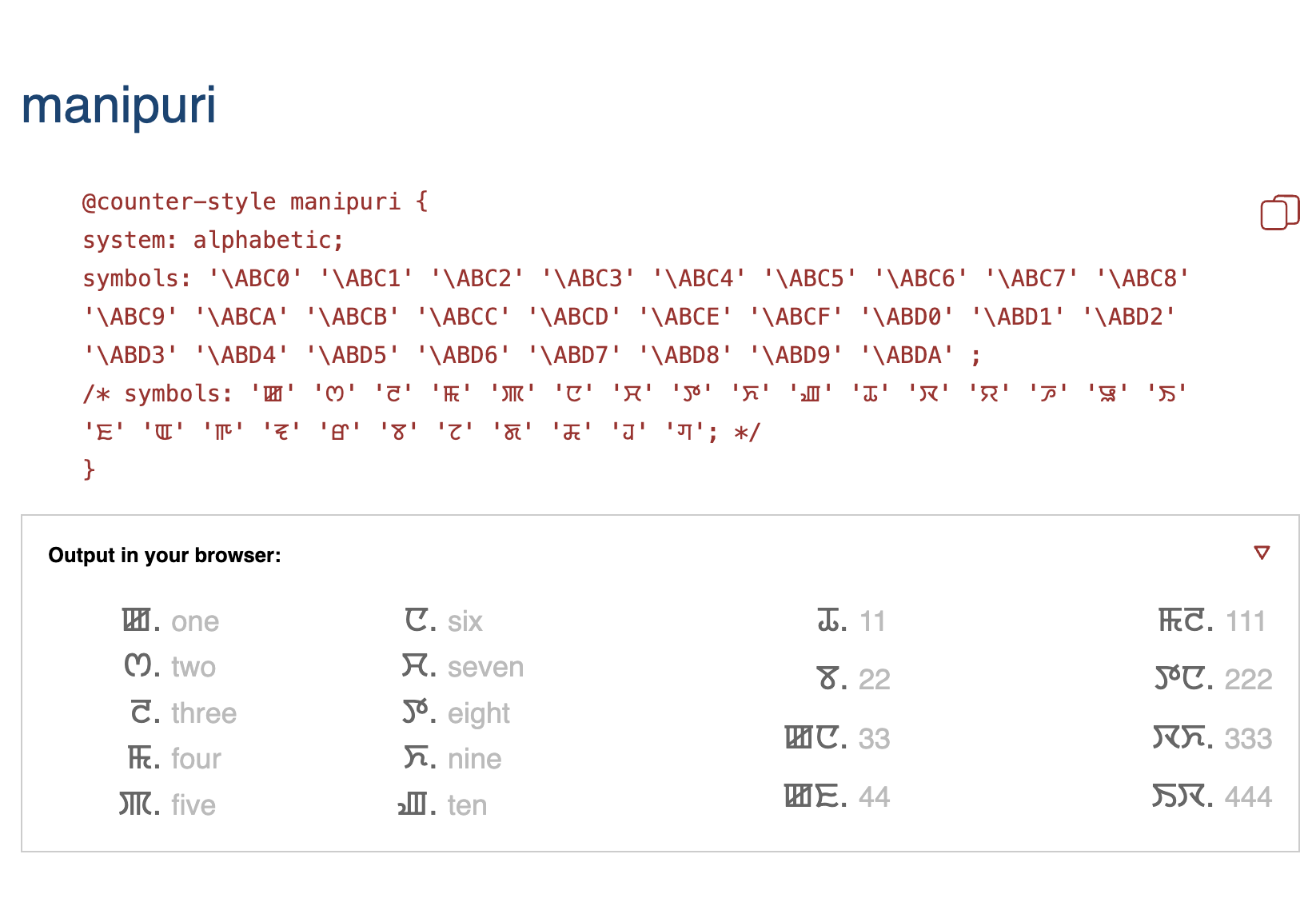 The changes include the addition of new styles for scripts including adlam, hanifi-rohingya, lepcha, meetei, santali, ethiopic and chinese. Instructions were also added for those wanting to use different suffixes or prefixes, according to the context in which the counter style is used.