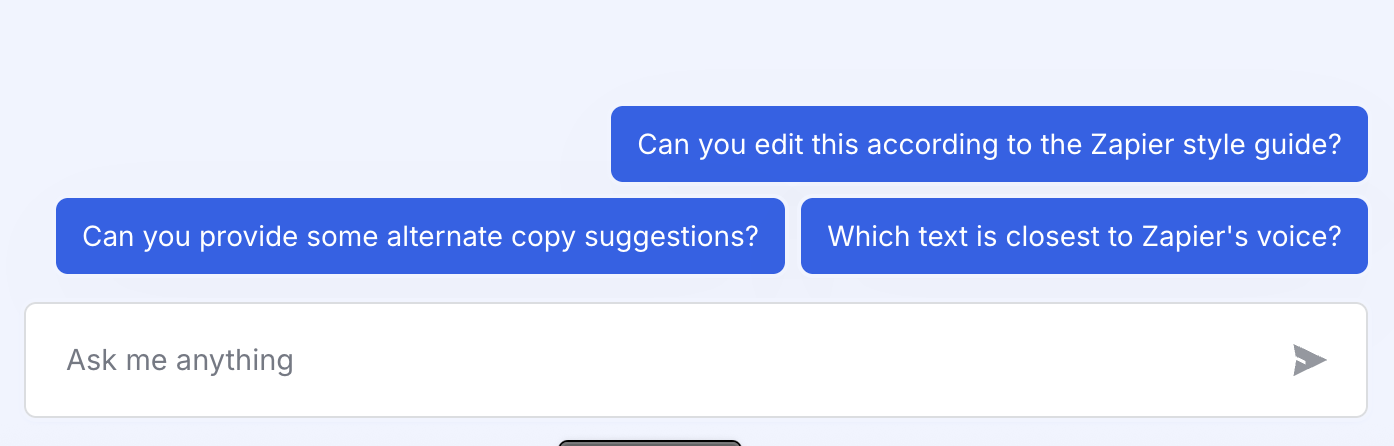 You can also interact with an AI system using a prompt in AI by Zapier, Agents, Copilot, Tables, and Canvas. For tips on writing effective prompts in Chatbots and other Zapier products, read our prompting help guide.